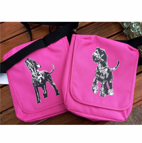Pieni olkalaukku riisenipainatuksella.